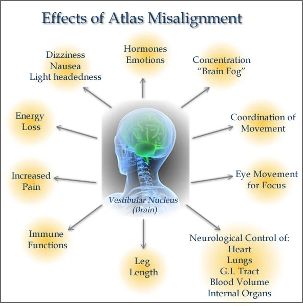 Once the atlas is moved out of its orthogonal position the body tries to compensate to maintain its center of gravity. It does this by keeping the head directly over the center of the feet. However to maintain the level position of the head the rest of the spine adapts and is thrown out of alignment. The resulting misalignment may cause nerve pressure and inflammation causing a disruption of the normal functioning of the nervous system. This one dysfunction may play a role in a multitude of symptoms and pain in different areas of the body.
